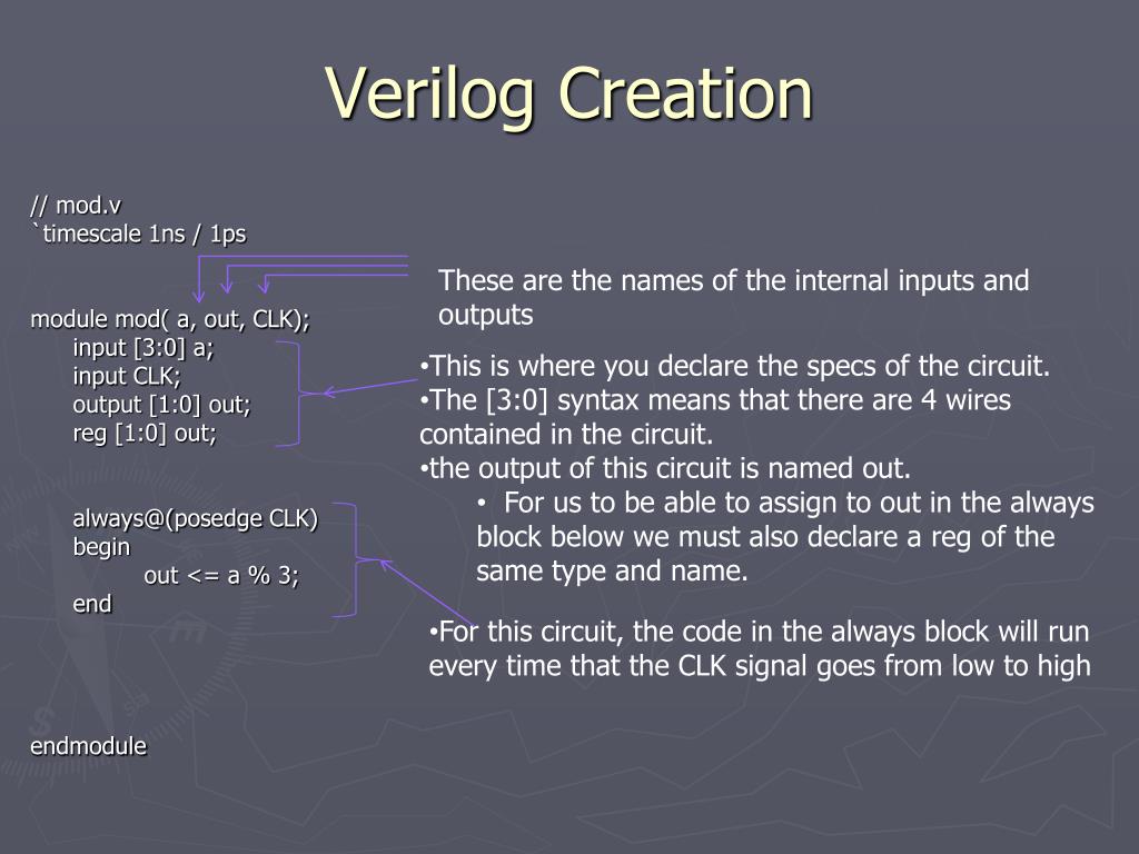 Verilog Creation These are the names of the internal inputs and outputs • This is where you declare the specs of the circuit. • The [3:0] syntax means that there are 4 wires contained in the circuit. • the output of this circuit is named out. • For us to be able to assign to out in the always block below we must also declare a reg of the same type and name. • For this circuit, the code in the always block will run every time that the CLK signal goes from low to high // mod.v `timescale 1ns / 1ps module mod( a, out, CLK); input [3:0] a; input CLK; output [1:0] out; reg [1:0] out; always@(posedge CLK) begin out <= a % 3; end endmodule
