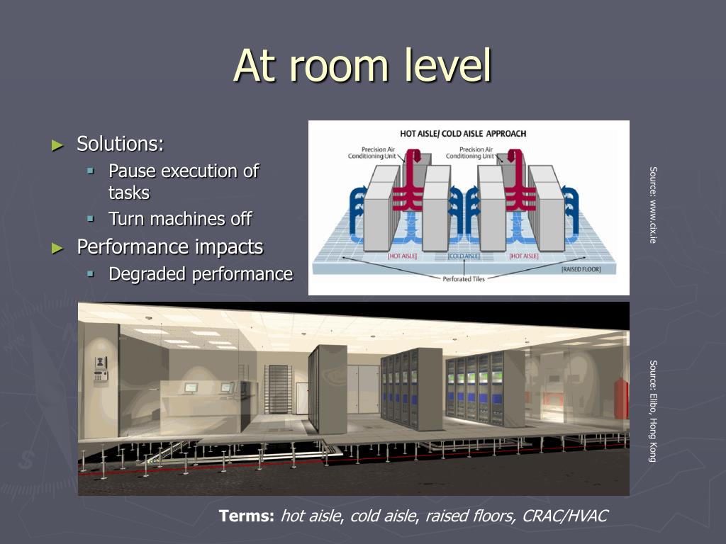 At room level • Solutions: • Pause execution of tasks • Turn machines off • Performance impacts • Degraded performance Source: www.cix.ie Source: Elibo, Hong Kong Terms:hot aisle, cold aisle, raised floors, CRAC/HVAC
