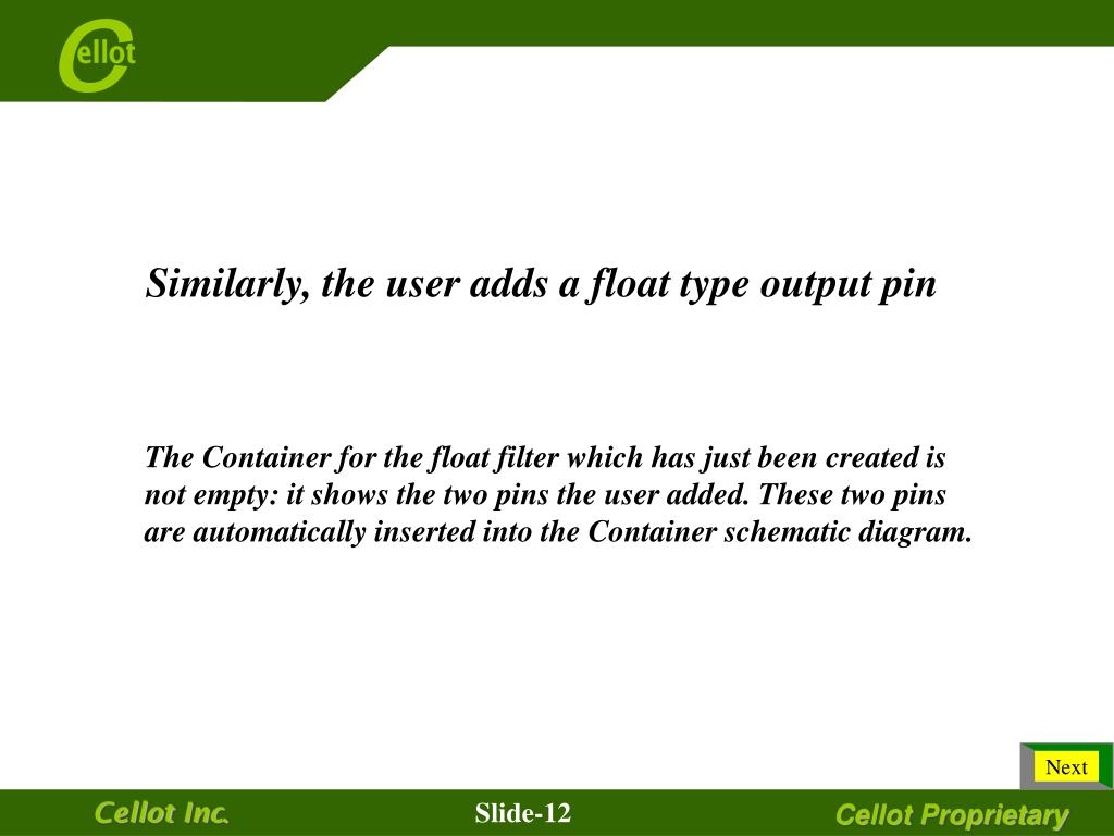 Next The user creates a Container to hold the reference (float type) application adds a grid, resizes the Container icon to the appropriate dimension and adds text to define the Container. The result is shown in the next slide. Cellot Inc. Slide-10 Cellot Proprietary
