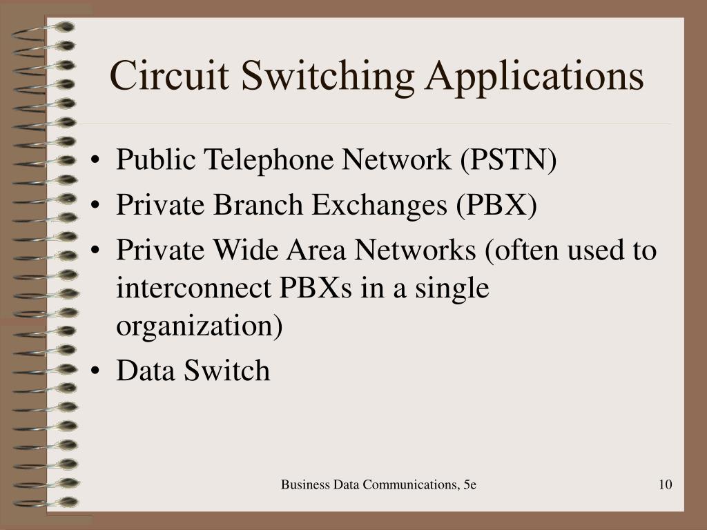 Circuit Switching Applications • Public Telephone Network (PSTN) • Private Branch Exchanges (PBX) • Private Wide Area Networks (often used to interconnect PBXs in a single organization) • Data Switch Business Data Communications, 5e