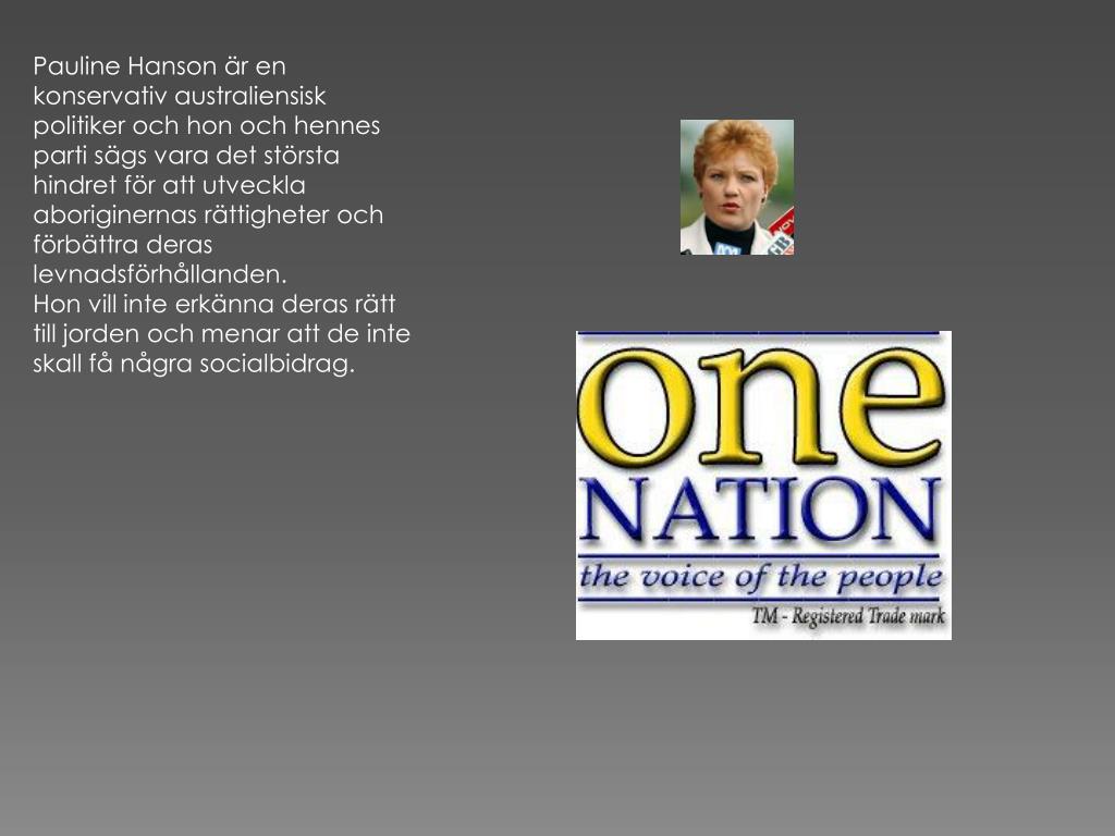 Pauline Hanson är en konservativ australiensisk politiker och hon och hennes parti sägs vara det största hindret för att utveckla aboriginernas rättigheter och förbättra deras levnadsförhållanden. Hon vill inte erkänna deras rätt till jorden och menar att de inte skall få några socialbidrag.
