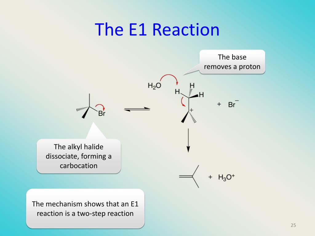 The E1 Reaction The base removes a proton The alkyl halide dissociate, forming a carbocation The mechanism shows that an E1 reaction is a two-step reaction