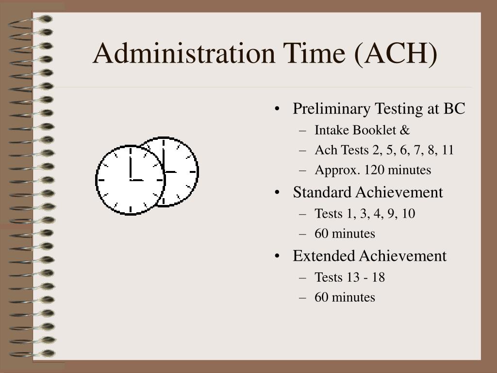 Administration Time (ACH) • Preliminary Testing at BC • Intake Booklet & • Ach Tests 2, 5, 6, 7, 8, 11 • Approx. 120 minutes • Standard Achievement • Tests 1, 3, 4, 9, 10 • 60 minutes • Extended Achievement • Tests 13 - 18 • 60 minutes