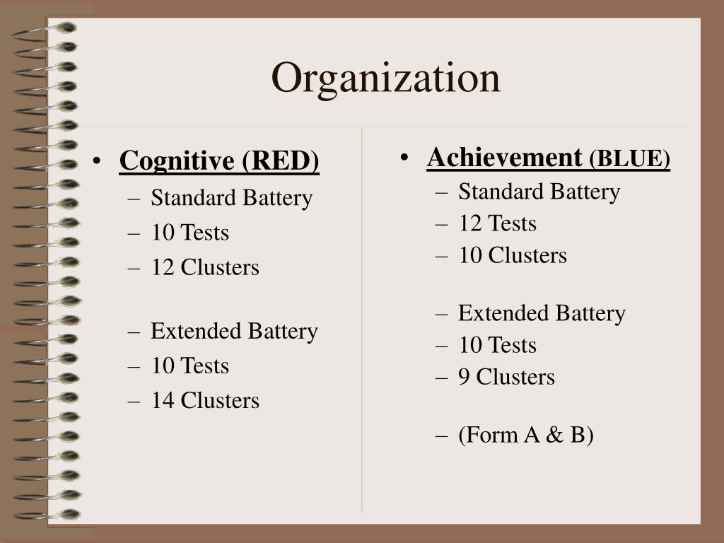 Cognitive (RED) Standard Battery 10 Tests 12 Clusters Extended Battery 10 Tests 14 Clusters Achievement (BLUE) Standard Battery 12 Tests 10 Clusters Extended Battery 10 Tests 9 Clusters (Form A & B) Organization