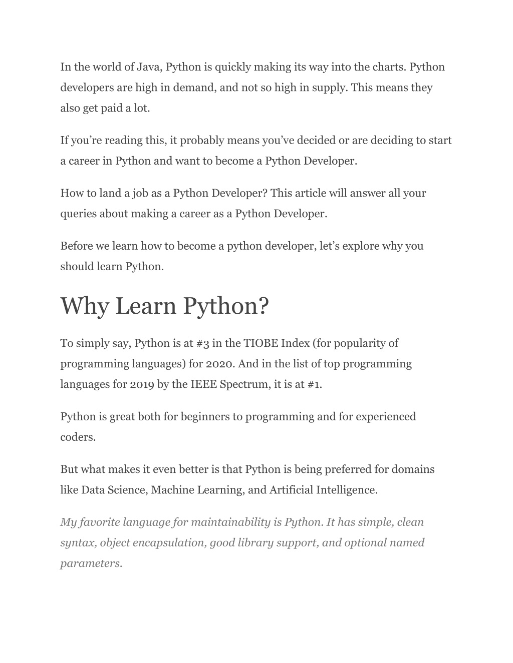 In the world of Java, Python is quickly making its way into the charts. Python developers are high in demand, and not so high in supply. This means they also get paid a lot. If you’re reading this, it probably means you’ve decided or are deciding to start a career in Python and want to become a Python Developer. How to land a job as a Python Developer? This article will answer all your queries about making a career as a Python Developer. Before we learn how to become a python developer, let’s explore why you should learn Python. Why Learn Python? To simply say, Python is at #3 in the TIOBE Index (for popularity of programming languages) for 2020. And in the list of top programming languages for 2019 by the IEEE Spectrum, it is at #1. Python is great both for beginners to programming and for experienced coders. But what makes it even better is that Python is being preferred for domains like Data Science, Machine Learning, and Artificial Intelligence. My favorite language for maintainability is Python. It has simple, clean syntax, object encapsulation, good library support, and optional named parameters.