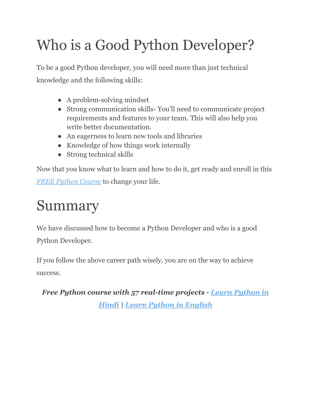Who is a Good Python Developer? To be a good Python developer, you will need more than just technical knowledge and the following skills: ● A problem-solving mindset ● Strong communication skills- You’ll need to communicate project requirements and features to your team. This will also help you write better documentation. ● An eagerness to learn new tools and libraries ● Knowledge of how things work internally ● Strong technical skills Now that you know what to learn and how to do it, get ready and enroll in this FREE Python Course to change your life. Summary We have discussed how to become a Python Developer and who is a good Python Developer. If you follow the above career path wisely, you are on the way to achieve success. Free Python course with 57 real-time projects - Learn Python in Hindi | Learn Python in English