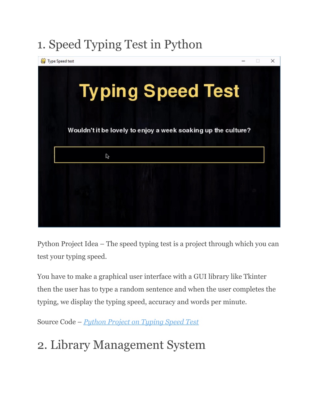 1. Speed Typing Test in Python Python Project Idea – The speed typing test is a project through which you can test your typing speed. You have to make a graphical user interface with a GUI library like Tkinter then the user has to type a random sentence and when the user completes the typing, we display the typing speed, accuracy and words per minute. Source Code – Python Project on Typing Speed Test 2. Library Management System