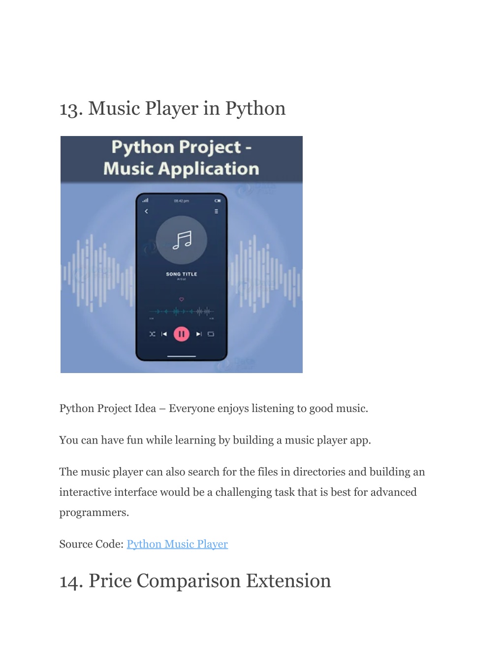 13. Music Player in Python Python Project Idea – Everyone enjoys listening to good music. You can have fun while learning by building a music player app. The music player can also search for the files in directories and building an interactive interface would be a challenging task that is best for advanced programmers. Source Code: Python Music Player 14. Price Comparison Extension
