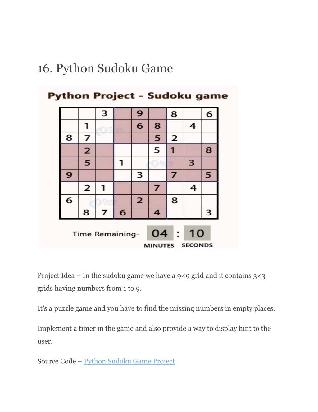 16. Python Sudoku Game Project Idea – In the sudoku game we have a 9×9 grid and it contains 3×3 grids having numbers from 1 to 9. It’s a puzzle game and you have to find the missing numbers in empty places. Implement a timer in the game and also provide a way to display hint to the user. Source Code – Python Sudoku Game Project