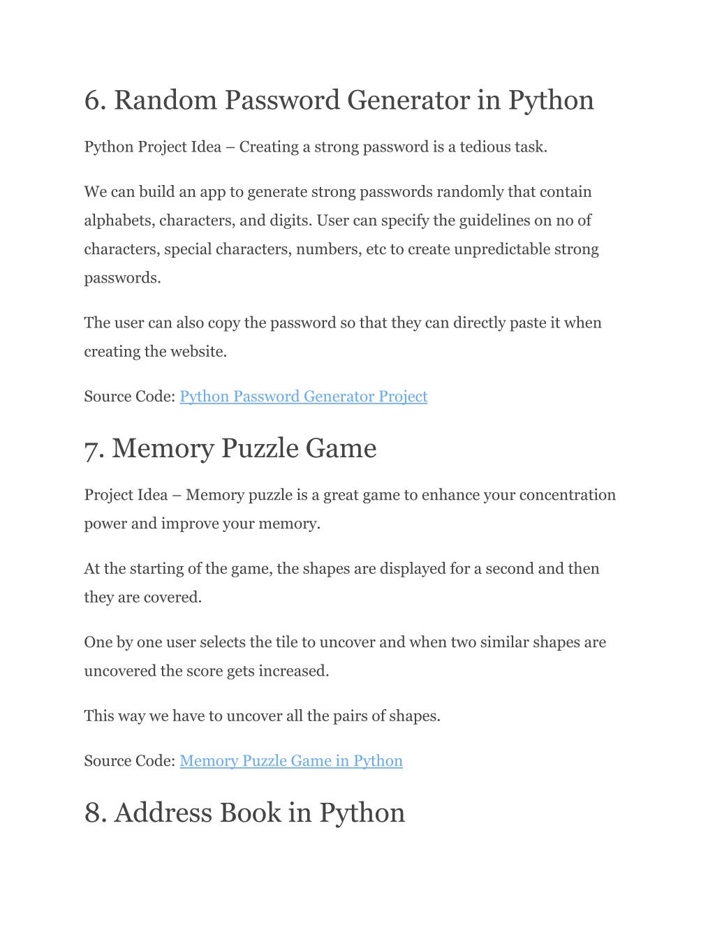 6. Random Password Generator in Python Python Project Idea – Creating a strong password is a tedious task. We can build an app to generate strong passwords randomly that contain alphabets, characters, and digits. User can specify the guidelines on no of characters, special characters, numbers, etc to create unpredictable strong passwords. The user can also copy the password so that they can directly paste it when creating the website. Source Code: Python Password Generator Project 7. Memory Puzzle Game Project Idea – Memory puzzle is a great game to enhance your concentration power and improve your memory. At the starting of the game, the shapes are displayed for a second and then they are covered. One by one user selects the tile to uncover and when two similar shapes are uncovered the score gets increased. This way we have to uncover all the pairs of shapes. Source Code: Memory Puzzle Game in Python 8. Address Book in Python