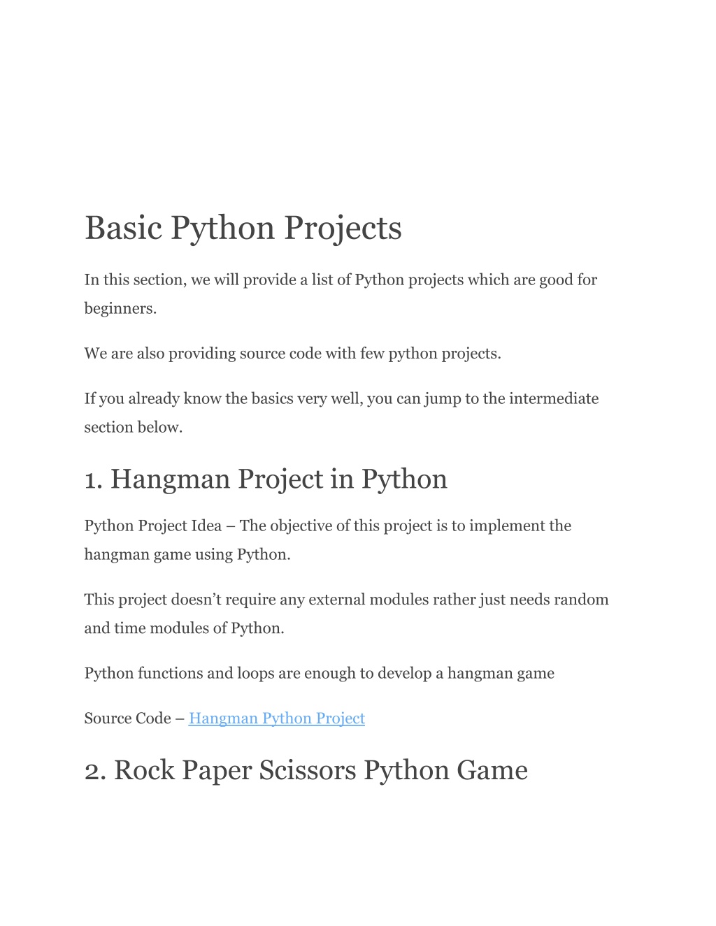 Basic Python Projects In this section, we will provide a list of Python projects which are good for beginners. We are also providing source code with few python projects. If you already know the basics very well, you can jump to the intermediate section below. 1. Hangman Project in Python Python Project Idea – The objective of this project is to implement the hangman game using Python. This project doesn’t require any external modules rather just needs random and time modules of Python. Python functions and loops are enough to develop a hangman game Source Code – Hangman Python Project 2. Rock Paper Scissors Python Game