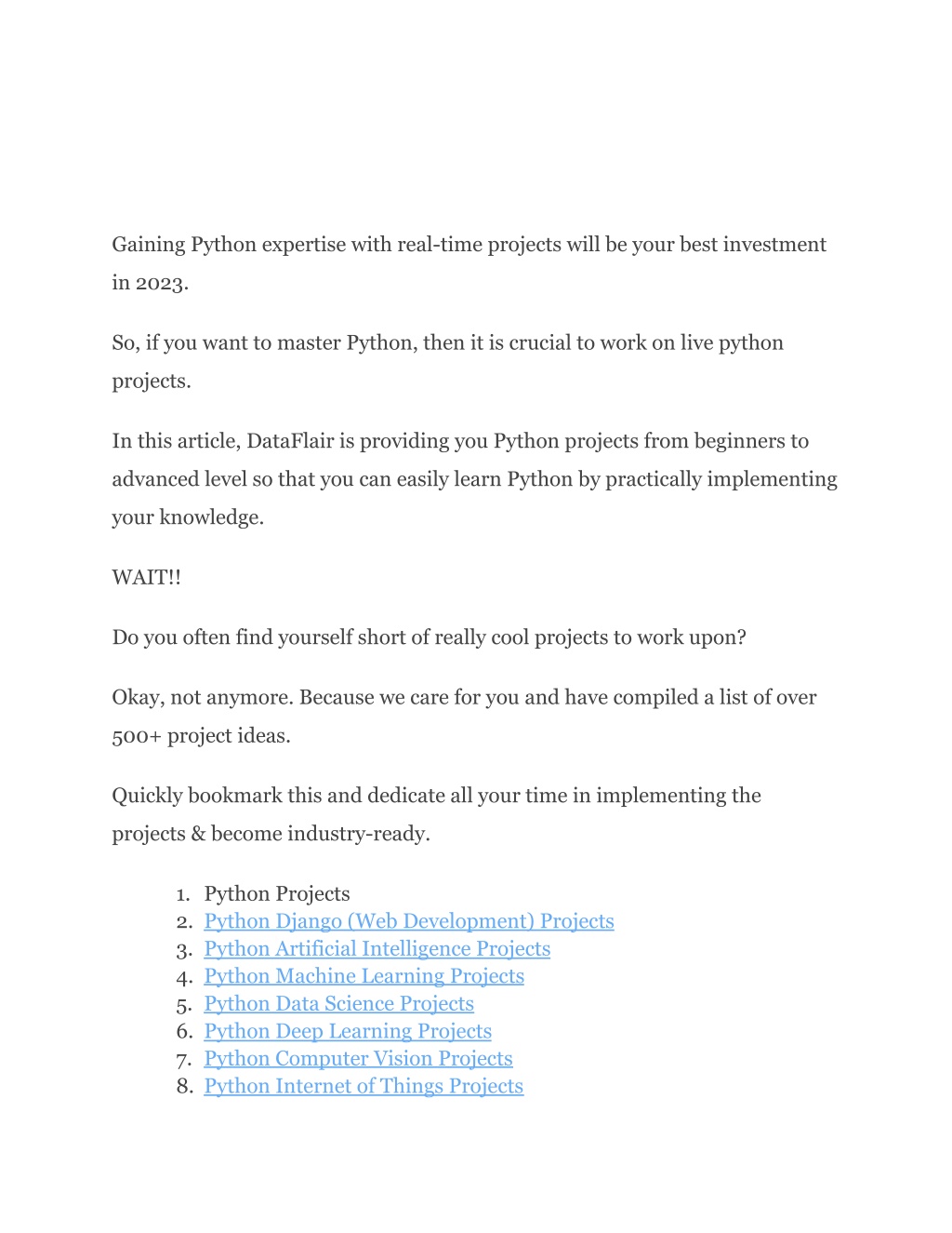 Gaining Python expertise with real-time projects will be your best investment in 2023. So, if you want to master Python, then it is crucial to work on live python projects. In this article, DataFlair is providing you Python projects from beginners to advanced level so that you can easily learn Python by practically implementing your knowledge. WAIT!! Do you often find yourself short of really cool projects to work upon? Okay, not anymore. Because we care for you and have compiled a list of over 500+ project ideas. Quickly bookmark this and dedicate all your time in implementing the projects & become industry-ready. 1.Python Projects 2.Python Django (Web Development) Projects 3.Python Artificial Intelligence Projects 4.Python Machine Learning Projects 5.Python Data Science Projects 6.Python Deep Learning Projects 7.Python Computer Vision Projects 8.Python Internet of Things Projects