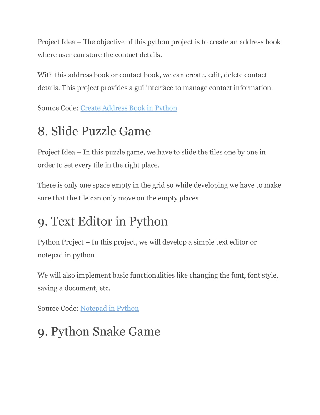 Project Idea – The objective of this python project is to create an address book where user can store the contact details. With this address book or contact book, we can create, edit, delete contact details. This project provides a gui interface to manage contact information. Source Code: Create Address Book in Python 8. Slide Puzzle Game Project Idea – In this puzzle game, we have to slide the tiles one by one in order to set every tile in the right place. There is only one space empty in the grid so while developing we have to make sure that the tile can only move on the empty places. 9. Text Editor in Python Python Project – In this project, we will develop a simple text editor or notepad in python. We will also implement basic functionalities like changing the font, font style, saving a document, etc. Source Code: Notepad in Python 9. Python Snake Game