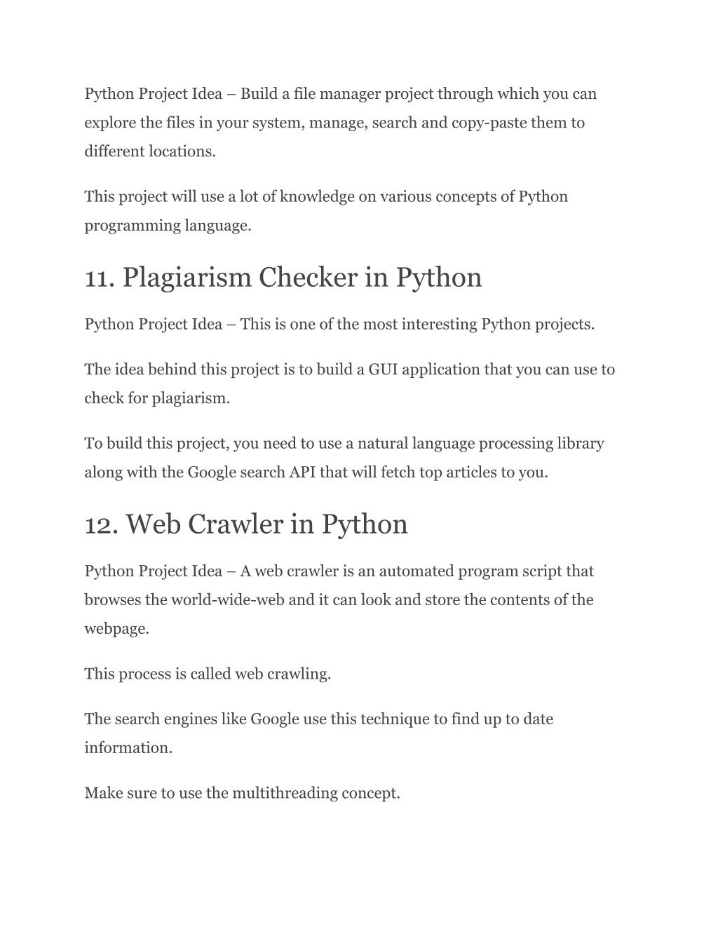 Python Project Idea – Build a file manager project through which you can explore the files in your system, manage, search and copy-paste them to different locations. This project will use a lot of knowledge on various concepts of Python programming language. 11. Plagiarism Checker in Python Python Project Idea – This is one of the most interesting Python projects. The idea behind this project is to build a GUI application that you can use to check for plagiarism. To build this project, you need to use a natural language processing library along with the Google search API that will fetch top articles to you. 12. Web Crawler in Python Python Project Idea – A web crawler is an automated program script that browses the world-wide-web and it can look and store the contents of the webpage. This process is called web crawling. The search engines like Google use this technique to find up to date information. Make sure to use the multithreading concept.