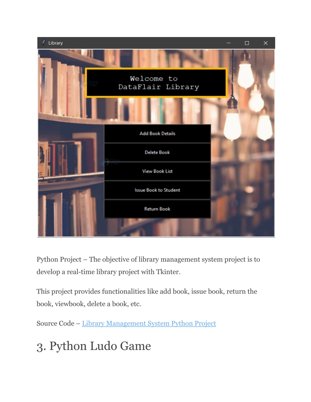 Python Project – The objective of library management system project is to develop a real-time library project with Tkinter. This project provides functionalities like add book, issue book, return the book, viewbook, delete a book, etc. Source Code – Library Management System Python Project 3. Python Ludo Game