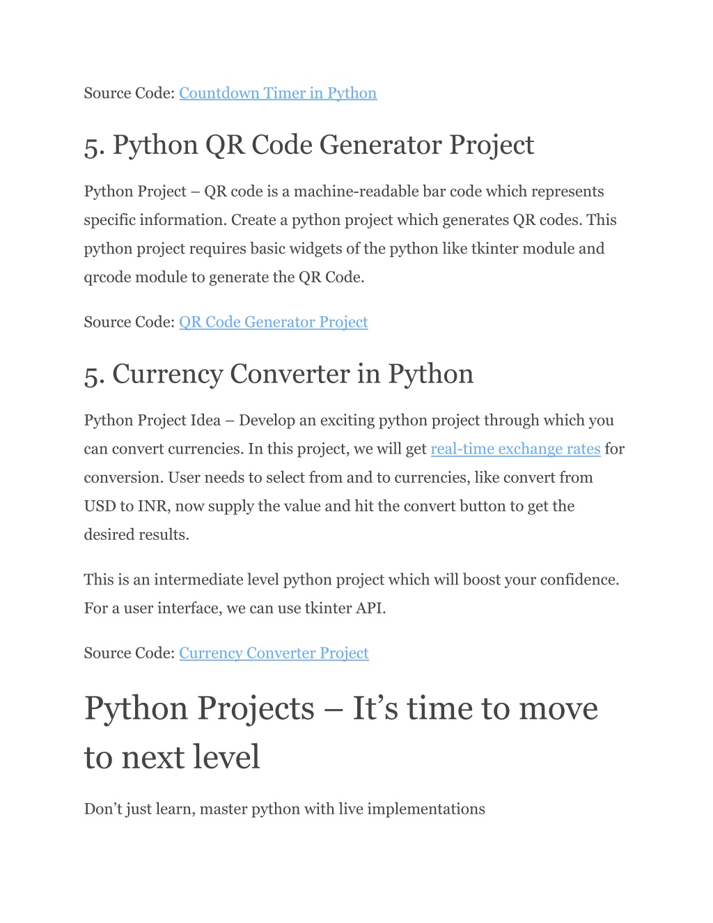 Source Code: Countdown Timer in Python 5. Python QR Code Generator Project Python Project – QR code is a machine-readable bar code which represents specific information. Create a python project which generates QR codes. This python project requires basic widgets of the python like tkinter module and qrcode module to generate the QR Code. Source Code: QR Code Generator Project 5. Currency Converter in Python Python Project Idea – Develop an exciting python project through which you can convert currencies. In this project, we will get real-time exchange rates for conversion. User needs to select from and to currencies, like convert from USD to INR, now supply the value and hit the convert button to get the desired results. This is an intermediate level python project which will boost your confidence. For a user interface, we can use tkinter API. Source Code: Currency Converter Project Python Projects – It’s time to move to next level Don’t just learn, master python with live implementations