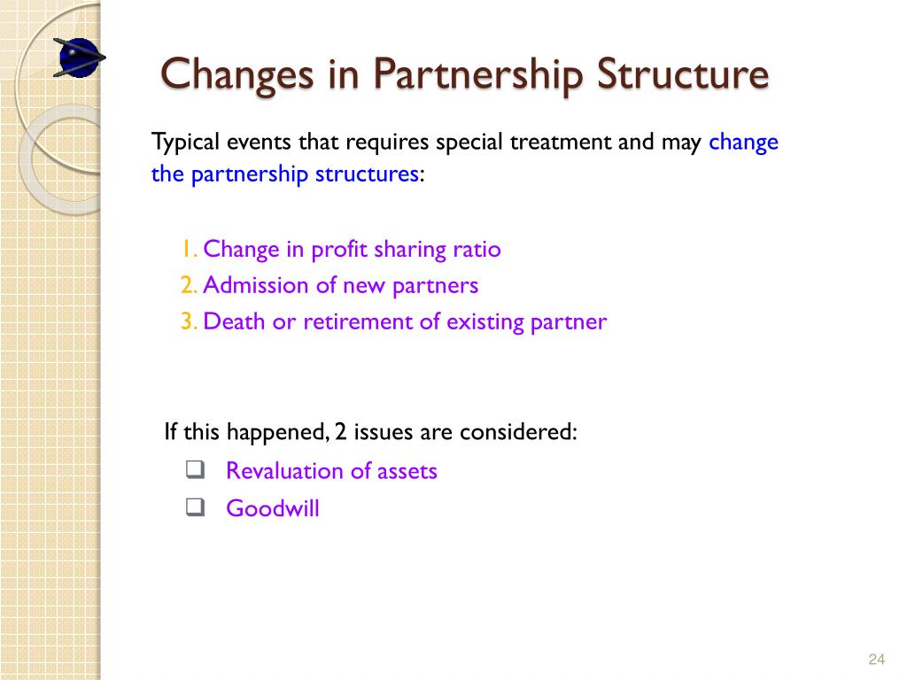 Changes in Partnership Structure Typical events that requires special treatment and may change the partnership structures: • Change in profit sharing ratio • Admission of new partners • Death or retirement of existing partner If this happened, 2 issues are considered: • Revaluation of assets • Goodwill