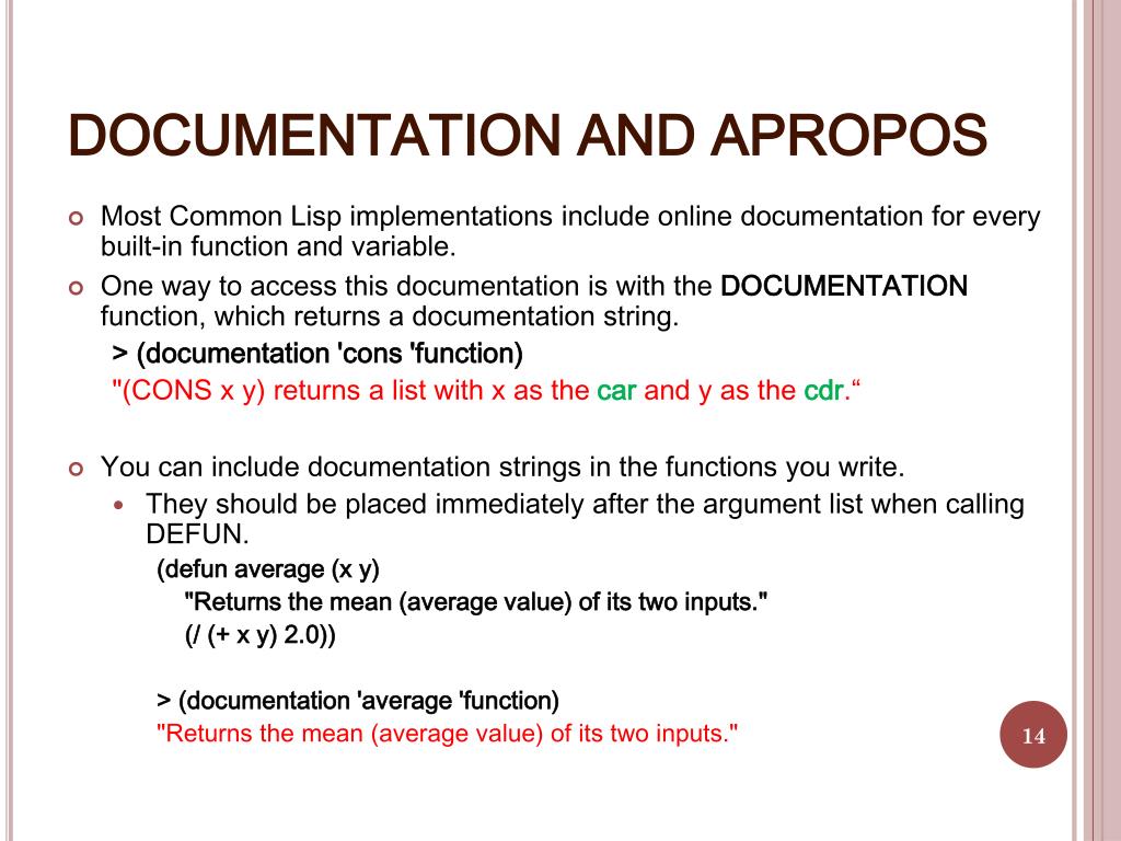 DOCUMENTATION AND APROPOS • Most Common Lisp implementations include online documentation for every built-in function and variable. • One way to access this documentation is with the DOCUMENTATION function, which returns a documentation string. > (documentation 'cons 'function) "(CONS x y) returns a list with x as the car and y as the cdr.“ • You can include documentation strings in the functions you write. • They should be placed immediately after the argument list when calling DEFUN. (defun average (x y) "Returns the mean (average value) of its two inputs." (/ (+ x y) 2.0)) > (documentation 'average 'function) "Returns the mean (average value) of its two inputs."