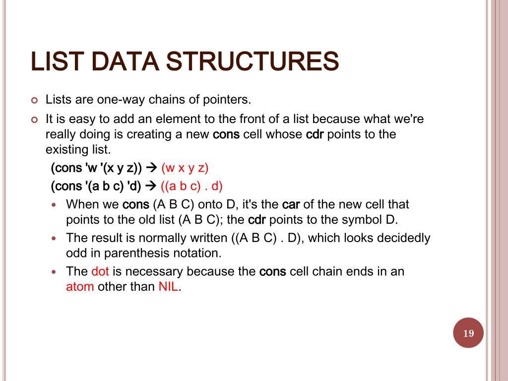 LIST DATA STRUCTURES • Lists are one-way chains of pointers. • It is easy to add an element to the front of a list because what we're really doing is creating a new cons cell whose cdr points to the existing list. (cons 'w '(x y z)) (w x y z) (cons '(a b c) 'd) ((a b c) . d) • When we cons (A B C) onto D, it's the car of the new cell that points to the old list (A B C); the cdr points to the symbol D. • The result is normally written ((A B C) . D), which looks decidedly odd in parenthesis notation. • The dot is necessary because the cons cell chain ends in an atom other than NIL.