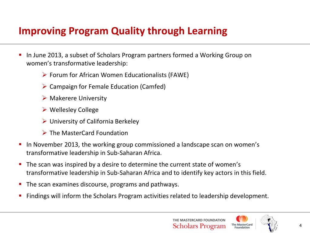 Improving Program Quality through Learning • In June 2013, a subset of Scholars Program partners formed a Working Group on women’s transformative leadership: • Forum for African Women Educationalists (FAWE) • Campaign for Female Education (Camfed) • Makerere University • Wellesley College • University of California Berkeley • The MasterCard Foundation • In November 2013, the working group commissioned a landscape scan on women’s transformative leadership in Sub-Saharan Africa. • The scan was inspired by a desire to determine the current state of women’s transformative leadership in Sub-Saharan Africa and to identify key actors in this field. • The scan examines discourse, programs and pathways. • Findings will inform the Scholars Program activities related to leadership development.
