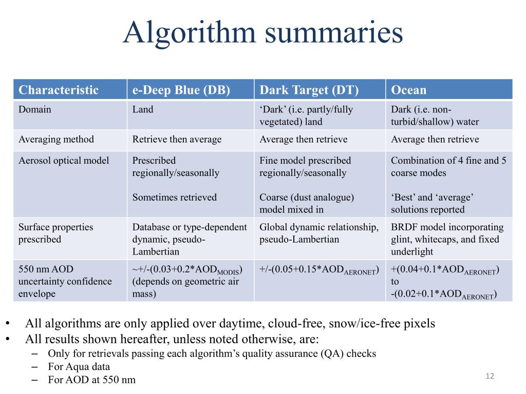 Algorithm summaries • All algorithms are only applied over daytime, cloud-free, snow/ice-free pixels • All results shown hereafter, unless noted otherwise, are: • Only for retrievals passing each algorithm’s quality assurance (QA) checks • For Aqua data • For AOD at 550 nm