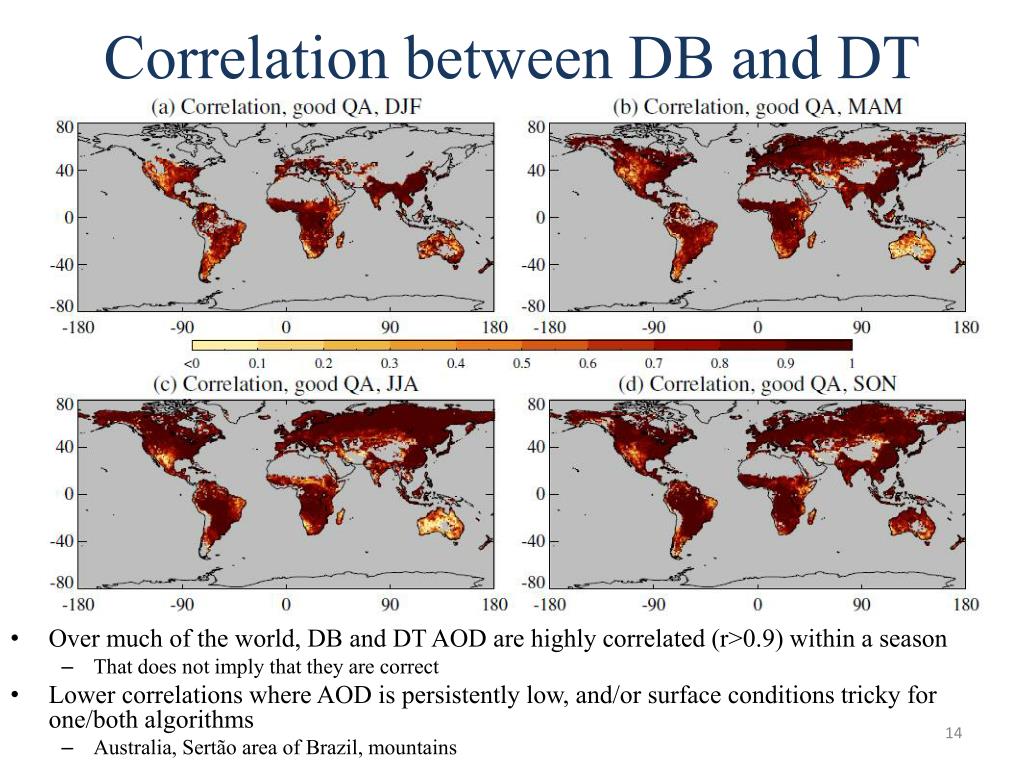 Correlation between DB and DT • Over much of the world, DB and DT AOD are highly correlated (r>0.9) within a season • That does not imply that they are correct • Lower correlations where AOD is persistently low, and/or surface conditions tricky for one/both algorithms • Australia, Sertão area of Brazil, mountains