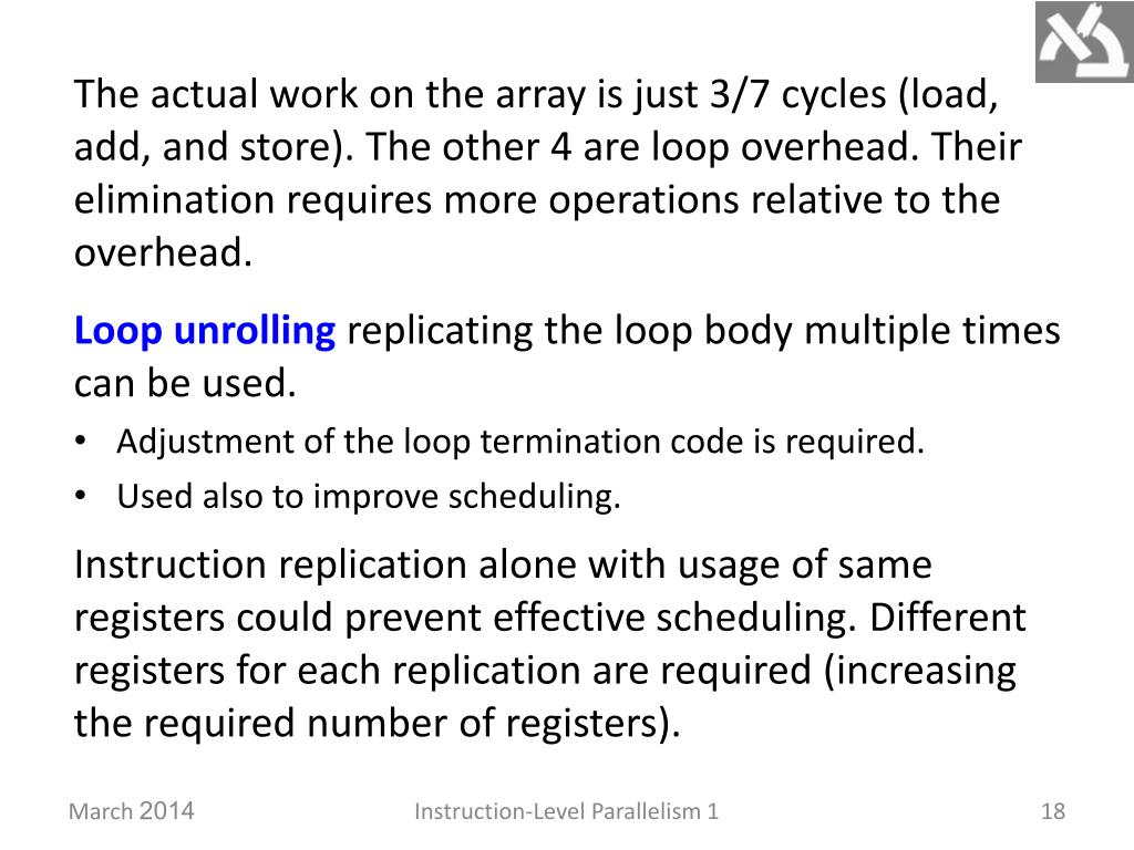 The actual work on the array is just 3/7 cycles (load, add, and store). The other 4 are loop overhead. Their elimination requires more operations relative to the overhead. • Loop unrollingreplicatingthe loop body multiple times can be used. • Adjustment of the loop termination code is required. • Used also to improve scheduling. Instruction replication alone with usage of same registers could prevent effective scheduling. Different registers for each replication are required (increasing the required number of registers). Instruction-Level Parallelism 1