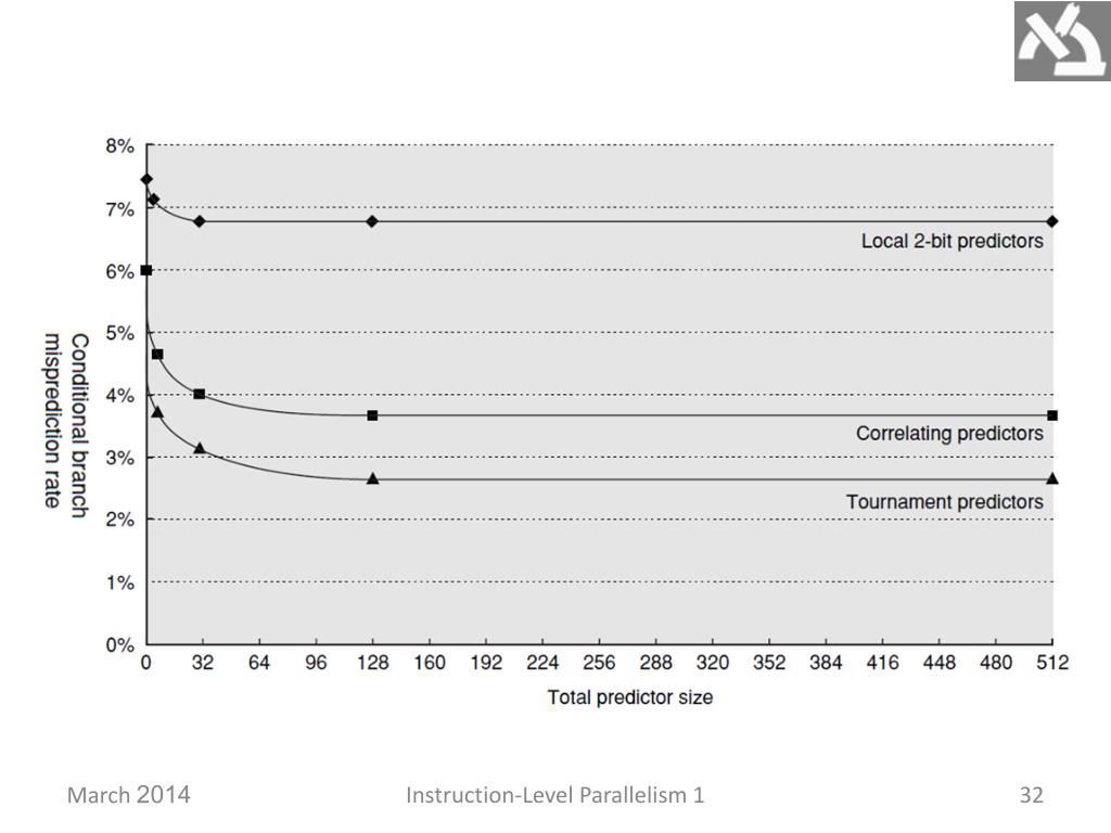Tournament Predictors Tournament predictors combine predictors based on global and local information. They achieve better accuracy and effectively use very large numbers of prediction bits. Tournament BPs use a 2-bit saturating counter per branch to select between two different BP (local, global), based on which was most effective in recent predictions. As in a simple 2-bit predictor, the saturating counter requires two mispredictions before changing the identity of the preferred BP. Instruction-Level Parallelism 1