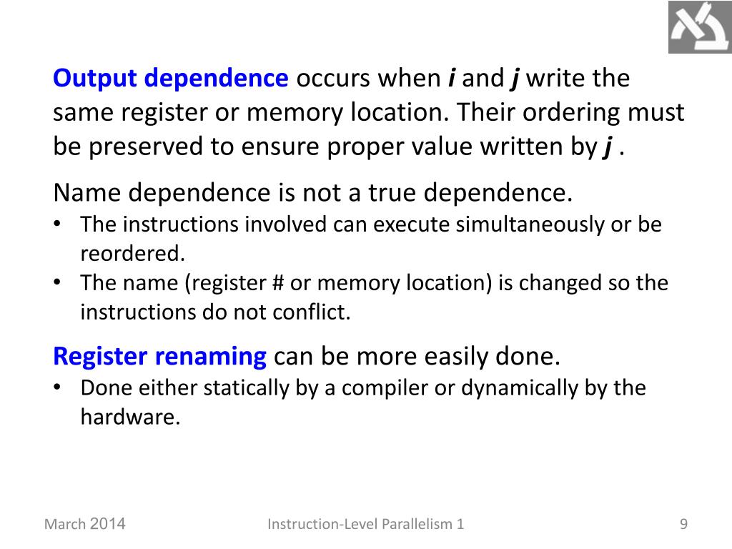 Output dependence occurs when iand jwrite the same register or memory location. Their ordering must be preserved to ensure proper value written by j. • Name dependence is not a true dependence. • The instructions involved can execute simultaneously or be reordered. • The name (register # or memory location) is changed so the instructions do not conflict. • Register renamingcan be more easily done. • Done either statically by a compiler or dynamically by the hardware. Instruction-Level Parallelism 1