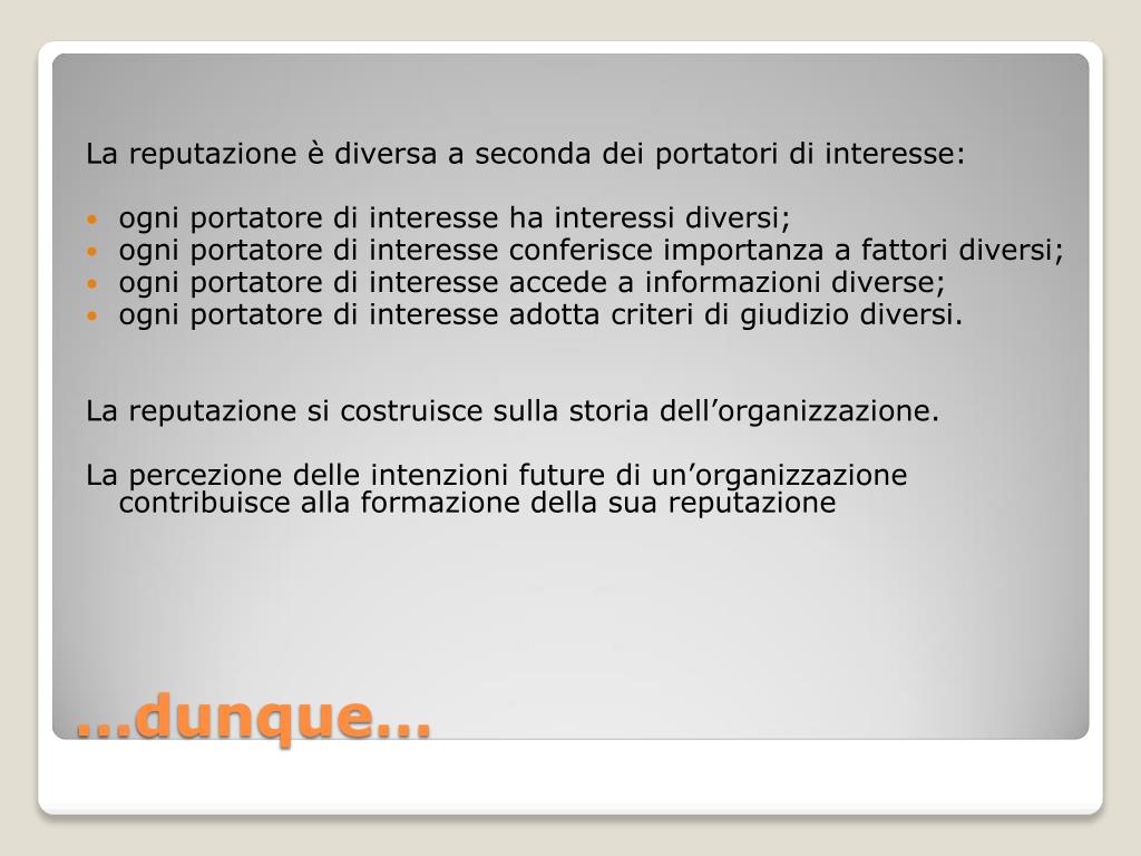 La reputazione è diversa a seconda dei portatori di interesse: • ogni portatore di interesse ha interessi diversi; • ogni portatore di interesse conferisce importanza a fattori diversi; • ogni portatore di interesse accede a informazioni diverse; • ogni portatore di interesse adotta criteri di giudizio diversi. La reputazione si costruisce sulla storia dell’organizzazione. La percezione delle intenzioni future di un’organizzazione contribuisce alla formazione della sua reputazione …dunque…