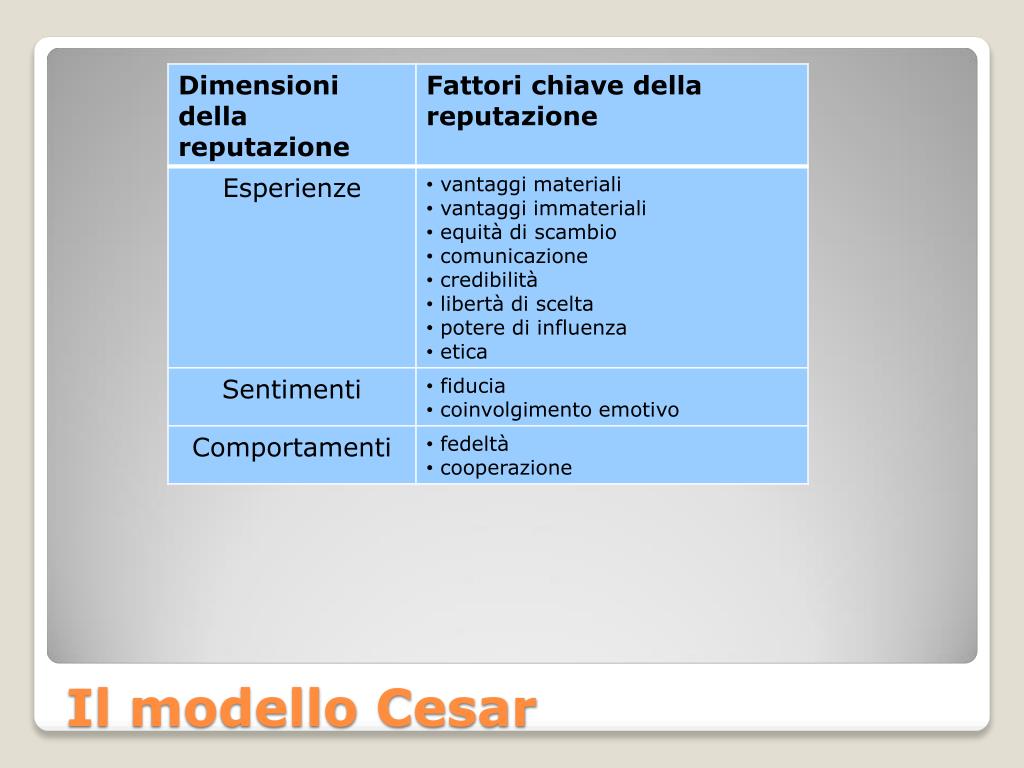La reputazione di un’organizzazione: • rappresenta un sistema di significati che gli individui usano per organizzare le impressioni sull’organizzazione • semplifica la realtà • influenza i comportamenti • se il grado di elaborazione degli stimoli ricevuti è alto, la comprensione razionale e la forza degli argomenti diventano determinanti per influenzare le opinioni e i comportamenti • se il grado di elaborazione è basso, allora elementi periferici come l’attrattiva della persona che comunica lo stimolo o il numero degli argomenti contenuti nel messaggio, diventano determinanti; Secondo gli psicologi 3/3