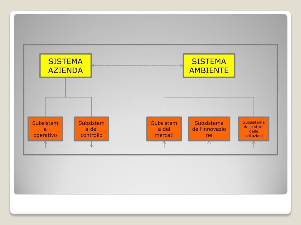 SISTEMA AZIENDA SISTEMA AMBIENTE Subsistema operativo Subsistema del controllo Subsistema dei mercati Subsistema dell’innovazione Subsistema dello stato delle istituzioni