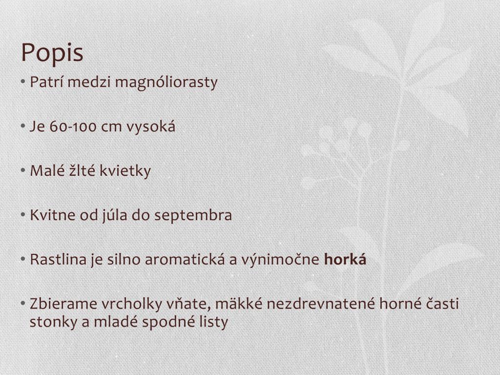 Popis • Patrí medzi magnóliorasty • Je 60-100 cm vysoká • Malé žlté kvietky • Kvitne od júla do septembra • Rastlina je silno aromatická a výnimočne horká • Zbierame vrcholky vňate, mäkké nezdrevnatené horné časti stonky a mladé spodné listy