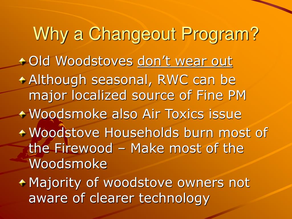 Why a Changeout Program? • Old Woodstoves don’t wear out • Although seasonal, RWC can be major localized source of Fine PM • Woodsmoke also Air Toxics issue • Woodstove Households burn most of the Firewood – Make most of the Woodsmoke • Majority of woodstove owners not aware of clearer technology
