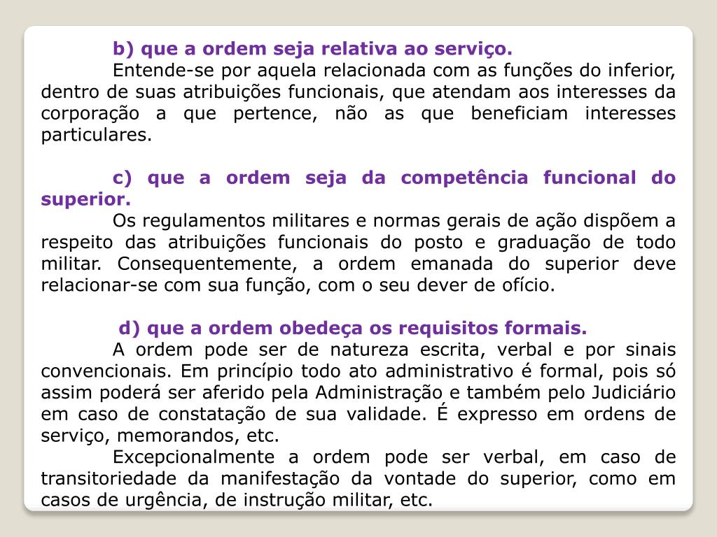 b) que a ordem seja relativa ao serviço. Entende-se por aquela relacionada com as funções do inferior, dentro de suas atribuições funcionais, que atendam aos interesses da corporação a que pertence, não as que beneficiam interesses particulares. c) que a ordem seja da competência funcional do superior. Os regulamentos militares e normas gerais de ação dispõem a respeito das atribuições funcionais do posto e graduação de todo militar. Consequentemente, a ordem emanada do superior deve relacionar-se com sua função, com o seu dever de ofício. d) que a ordem obedeça os requisitos formais. A ordem pode ser de natureza escrita, verbal e por sinais convencionais. Em princípio todo ato administrativo é formal, pois só assim poderá ser aferido pela Administração e também pelo Judiciário em caso de constatação de sua validade. É expresso em ordens de serviço, memorandos, etc. Excepcionalmente a ordem pode ser verbal, em caso de transitoriedade da manifestação da vontade do superior, como em casos de urgência, de instrução militar, etc.