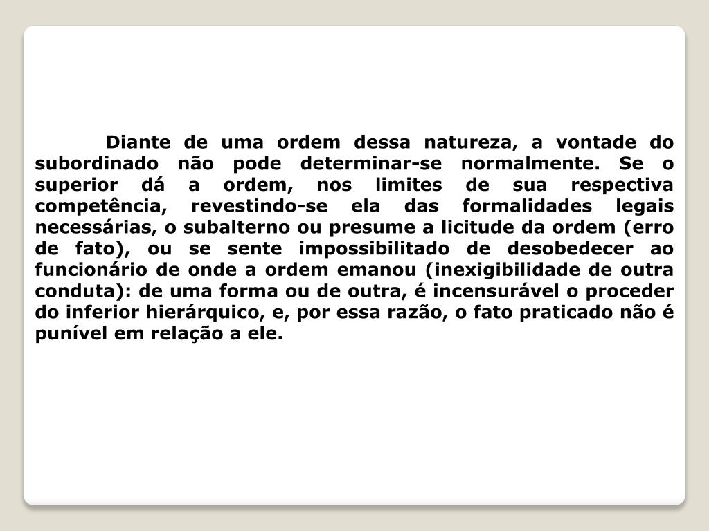 Diante de uma ordem dessa natureza, a vontade do subordinado não pode determinar-se normalmente. Se o superior dá a ordem, nos limites de sua respectiva competência, revestindo-se ela das formalidades legais necessárias, o subalterno ou presume a licitude da ordem (erro de fato), ou se sente impossibilitado de desobedecer ao funcionário de onde a ordem emanou (inexigibilidade de outra conduta): de uma forma ou de outra, é incensurável o proceder do inferior hierárquico, e, por essa razão, o fato praticado não é punível em relação a ele.