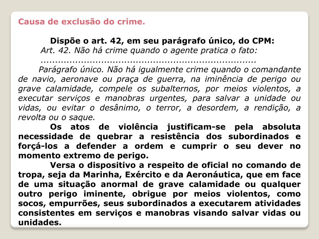 Causa de exclusão do crime. Dispõe o art. 42, em seu parágrafo único, do CPM: Art. 42. Não há crime quando o agente pratica o fato: ........................................................................... Parágrafo único. Não há igualmente crime quando o comandante de navio, aeronave ou praça de guerra, na iminência de perigo ou grave calamidade, compele os subalternos, por meios violentos, a executar serviços e manobras urgentes, para salvar a unidade ou vidas, ou evitar o desânimo, o terror, a desordem, a rendição, a revolta ou o saque. Os atos de violência justificam-se pela absoluta necessidade de quebrar a resistência dos subordinados e forçá-los a defender a ordem e cumprir o seu dever no momento extremo de perigo. Versa o dispositivo a respeito de oficial no comando de tropa, seja da Marinha, Exército e da Aeronáutica, que em face de uma situação anormal de grave calamidade ou qualquer outro perigo iminente, obrigue por meios violentos, como socos, empurrões, seus subordinados a executarem atividades consistentes em serviços e manobras visando salvar vidas ou unidades.