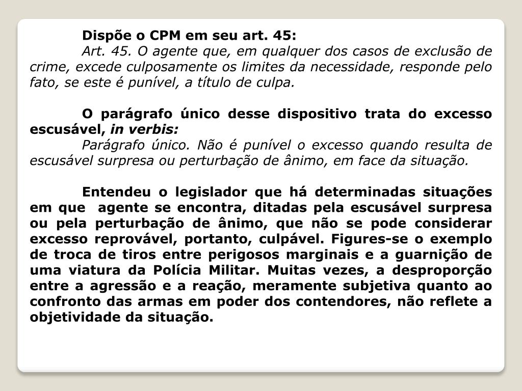 Dispõe o CPM em seu art. 45: Art. 45. O agente que, em qualquer dos casos de exclusão de crime, excede culposamente os limites da necessidade, responde pelo fato, se este é punível, a título de culpa. O parágrafo único desse dispositivo trata do excesso escusável, in verbis: Parágrafo único. Não é punível o excesso quando resulta de escusável surpresa ou perturbação de ânimo, em face da situação. Entendeu o legislador que há determinadas situações em que agente se encontra, ditadas pela escusável surpresa ou pela perturbação de ânimo, que não se pode considerar excesso reprovável, portanto, culpável. Figures-se o exemplo de troca de tiros entre perigosos marginais e a guarnição de uma viatura da Polícia Militar. Muitas vezes, a desproporção entre a agressão e a reação, meramente subjetiva quanto ao confronto das armas em poder dos contendores, não reflete a objetividade da situação.