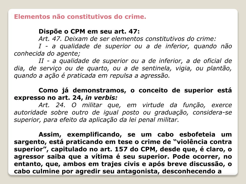 Elementos não constitutivos do crime. Dispõe o CPM em seu art. 47: Art. 47. Deixam de ser elementos constitutivos do crime: I - a qualidade de superior ou a de inferior, quando não conhecida do agente; II - a qualidade de superior ou a de inferior, a de oficial de dia, de serviço ou de quarto, ou a de sentinela, vigia, ou plantão, quando a ação é praticada em repulsa a agressão. Como já demonstramos, o conceito de superior está expresso no art. 24, in verbis: Art. 24. O militar que, em virtude da função, exerce autoridade sobre outro de igual posto ou graduação, considera-se superior, para efeito da aplicação da lei penal militar. Assim, exemplificando, se um cabo esbofeteia um sargento, está praticando em tese o crime de “violência contra superior”, capitulado no art. 157 do CPM, desde que, é claro, o agressor saiba que a vítima é seu superior. Pode ocorrer, no entanto, que, ambos em trajes civis e após breve discussão, o cabo culmine por agredir seu antagonista, desconhecendo a