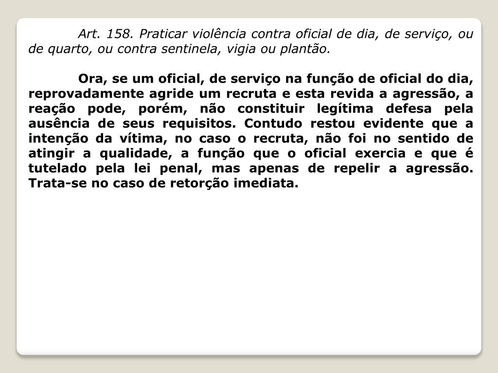 Art. 158. Praticar violência contra oficial de dia, de serviço, ou de quarto, ou contra sentinela, vigia ou plantão. Ora, se um oficial, de serviço na função de oficial do dia, reprovadamente agride um recruta e esta revida a agressão, a reação pode, porém, não constituir legítima defesa pela ausência de seus requisitos. Contudo restou evidente que a intenção da vítima, no caso o recruta, não foi no sentido de atingir a qualidade, a função que o oficial exercia e que é tutelado pela lei penal, mas apenas de repelir a agressão. Trata-se no caso de retorção imediata.