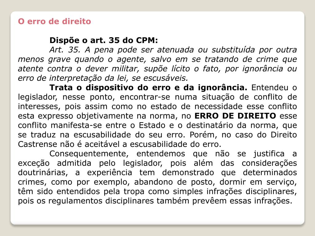 O erro de direito Dispõe o art. 35 do CPM: Art. 35. A pena pode ser atenuada ou substituída por outra menos grave quando o agente, salvo em se tratando de crime que atente contra o dever militar, supõe lícito o fato, por ignorância ou erro de interpretação da lei, se escusáveis. Trata o dispositivo do erro e da ignorância. Entendeu o legislador, nesse ponto, encontrar-se numa situação de conflito de interesses, pois assim como no estado de necessidade esse conflito esta expresso objetivamente na norma, no ERRO DE DIREITO esse conflito manifesta-se entre o Estado e o destinatário da norma, que se traduz na escusabilidade do seu erro. Porém, no caso do Direito Castrense não é aceitável a escusabilidade do erro. Consequentemente, entendemos que não se justifica a exceção admitida pelo legislador, pois além das considerações doutrinárias, a experiência tem demonstrado que determinados crimes, como por exemplo, abandono de posto, dormir em serviço, têm sido entendidos pela tropa como simples infrações disciplinares, pois os regulamentos disciplinares também prevêem essas infrações.