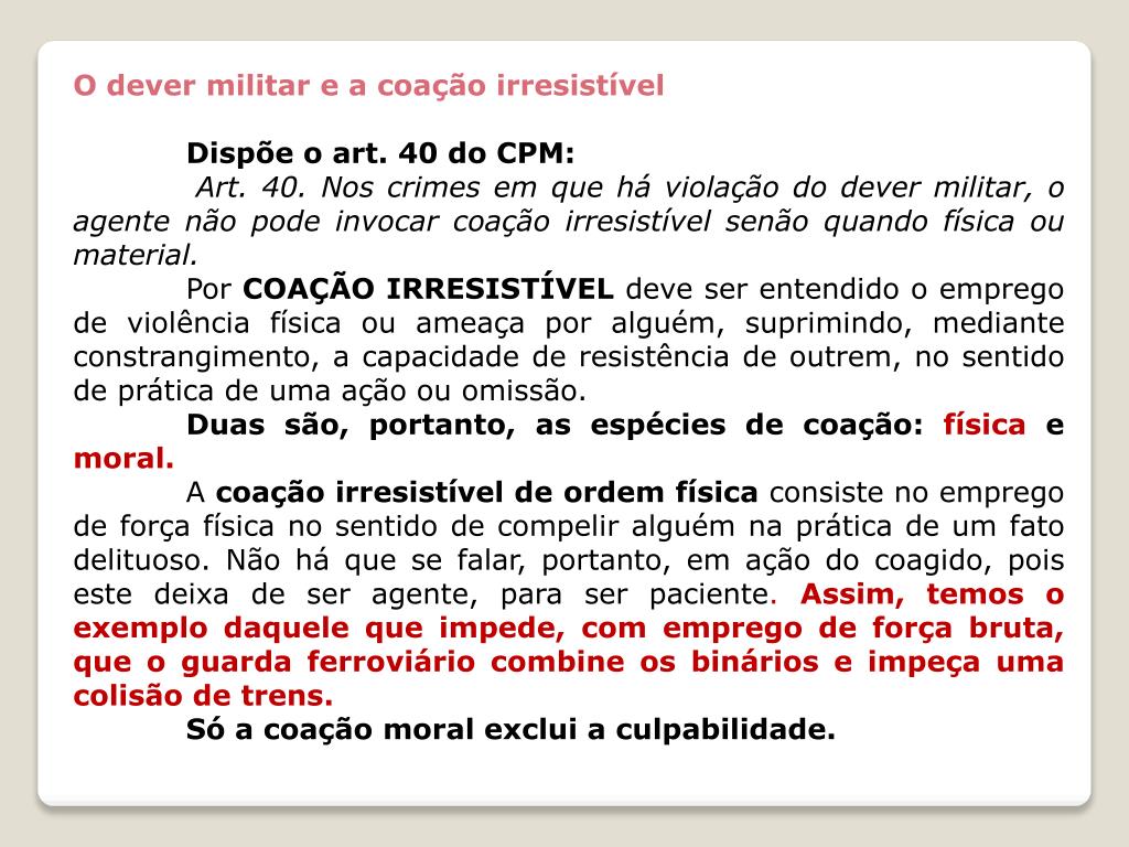 O dever militar e a coação irresistível Dispõe o art. 40 do CPM: Art. 40. Nos crimes em que há violação do dever militar, o agente não pode invocar coação irresistível senão quando física ou material. Por COAÇÃO IRRESISTÍVEL deve ser entendido o emprego de violência física ou ameaça por alguém, suprimindo, mediante constrangimento, a capacidade de resistência de outrem, no sentido de prática de uma ação ou omissão. Duas são, portanto, as espécies de coação: física e moral. A coação irresistível de ordem física consiste no emprego de força física no sentido de compelir alguém na prática de um fato delituoso. Não há que se falar, portanto, em ação do coagido, pois este deixa de ser agente, para ser paciente. Assim, temos o exemplo daquele que impede, com emprego de força bruta, que o guarda ferroviário combine os binários e impeça uma colisão de trens. Só a coação moral exclui a culpabilidade.