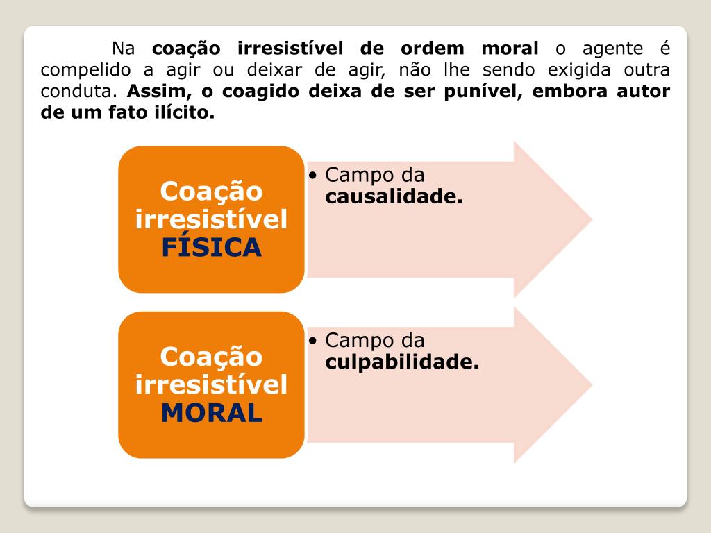 Na coação irresistível de ordem moral o agente é compelido a agir ou deixar de agir, não lhe sendo exigida outra conduta. Assim, o coagido deixa de ser punível, embora autor de um fato ilícito.