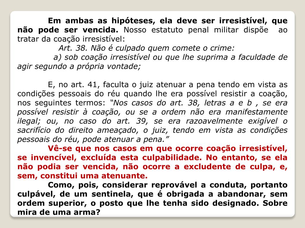 Em ambas as hipóteses, ela deve ser irresistível, que não pode ser vencida. Nosso estatuto penal militar dispõe ao tratar da coação irresistível: Art. 38. Não é culpado quem comete o crime: a) sob coação irresistível ou que lhe suprima a faculdade de agir segundo a própria vontade; E, no art. 41, faculta o juiz atenuar a pena tendo em vista as condições pessoais do réu quando lhe era possível resistir a coação, nos seguintes termos: “Nos casos do art. 38, letras a e b , se era possível resistir à coação, ou se a ordem não era manifestamente ilegal; ou, no caso do art. 39, se era razoavelmente exigível o sacrifício do direito ameaçado, o juiz, tendo em vista as condições pessoais do réu, pode atenuar a pena.” Vê-se que nos casos em que ocorre coação irresistível, se invencível, excluída esta culpabilidade. No entanto, se ela não podia ser vencida, não ocorre a excludente de culpa, e, sem, constitui uma atenuante. Como, pois, considerar reprovável a conduta, portanto culpável, de um sentinela, que é obrigada a abandonar, sem ordem superior, o posto que lhe tenha sido designado. Sobre mira de uma arma?
