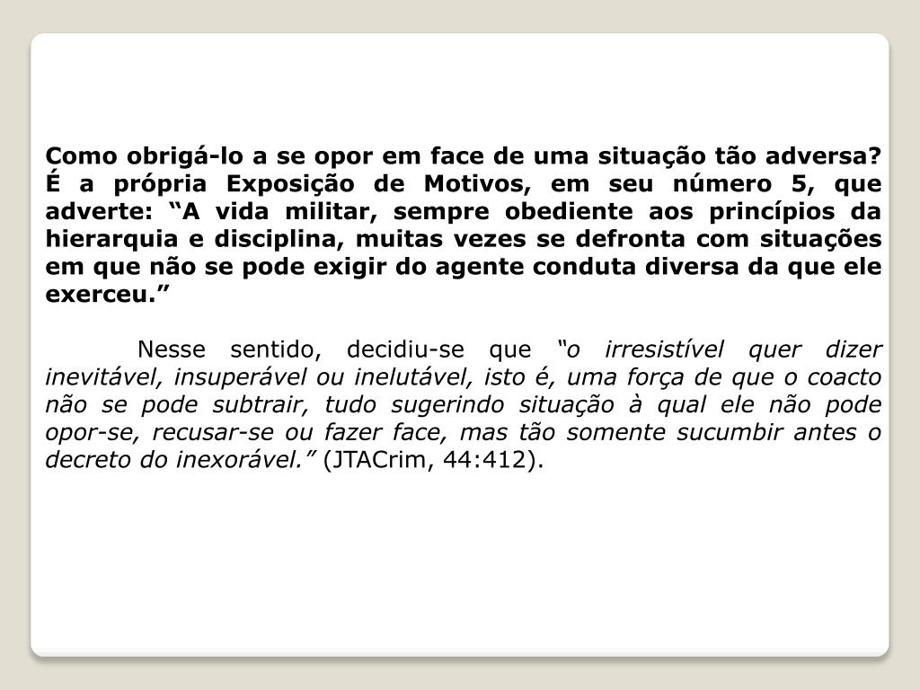 Como obrigá-lo a se opor em face de uma situação tão adversa? É a própria Exposição de Motivos, em seu número 5, que adverte: “A vida militar, sempre obediente aos princípios da hierarquia e disciplina, muitas vezes se defronta com situações em que não se pode exigir do agente conduta diversa da que ele exerceu.” Nesse sentido, decidiu-se que “o irresistível quer dizer inevitável, insuperável ou inelutável, isto é, uma força de que o coacto não se pode subtrair, tudo sugerindo situação à qual ele não pode opor-se, recusar-se ou fazer face, mas tão somente sucumbir antes o decreto do inexorável.” (JTACrim, 44:412).