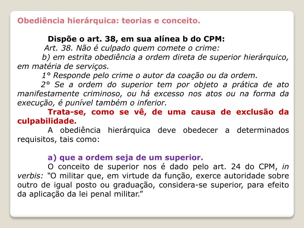 Obediência hierárquica: teorias e conceito. Dispõe o art. 38, em sua alínea b do CPM: Art. 38. Não é culpado quem comete o crime: b) em estrita obediência a ordem direta de superior hierárquico, em matéria de serviços. 1° Responde pelo crime o autor da coação ou da ordem. 2° Se a ordem do superior tem por objeto a prática de ato manifestamente criminoso, ou há excesso nos atos ou na forma da execução, é punível também o inferior. Trata-se, como se vê, de uma causa de exclusão da culpabilidade. A obediência hierárquica deve obedecer a determinados requisitos, tais como: a) que a ordem seja de um superior. O conceito de superior nos é dado pelo art. 24 do CPM, in verbis: “O militar que, em virtude da função, exerce autoridade sobre outro de igual posto ou graduação, considera-se superior, para efeito da aplicação da lei penal militar.”