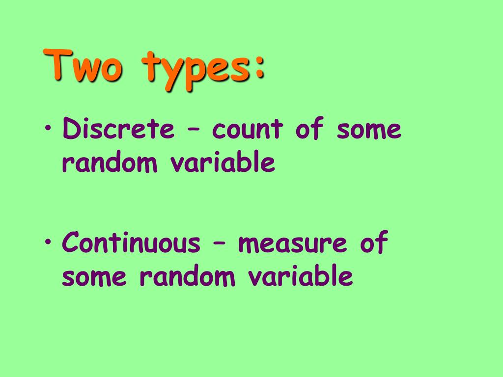 Two types: • Discrete – count of some random variable • Continuous – measure of some random variable