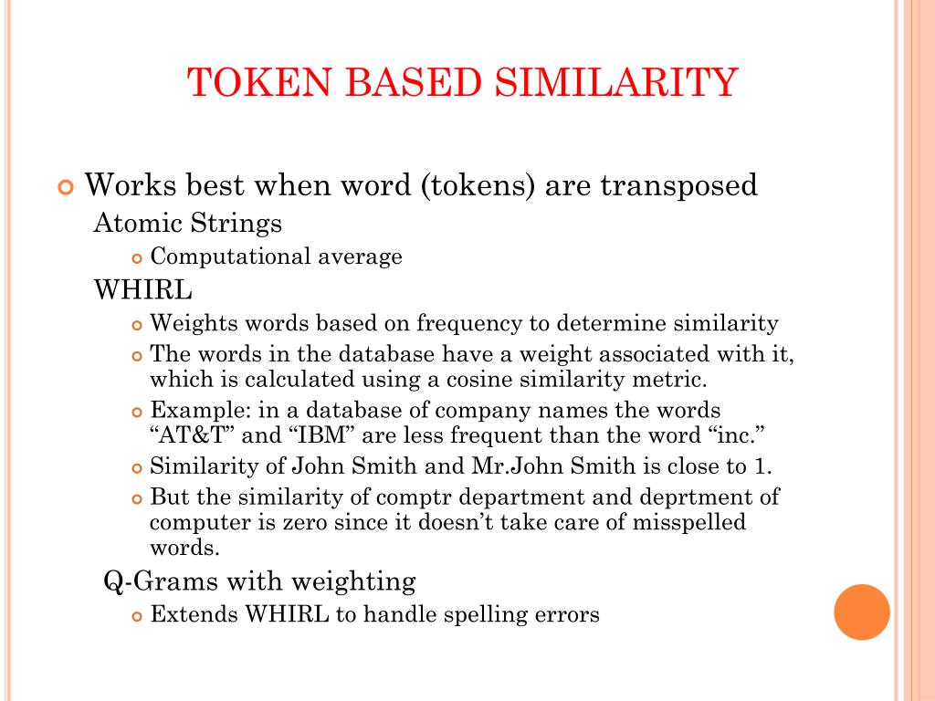 TOKEN BASED SIMILARITY • Works best when word (tokens) are transposed Atomic Strings • Computational average WHIRL • Weights words based on frequency to determine similarity • The words in the database have a weight associated with it, which is calculated using a cosine similarity metric. • Example: in a database of company names the words “AT&T” and “IBM” are less frequent than the word “inc.” • Similarity of John Smith and Mr.John Smith is close to 1. • But the similarity of comptr department and deprtment of computer is zero since it doesn’t take care of misspelled words. Q-Grams with weighting • Extends WHIRL to handle spelling errors