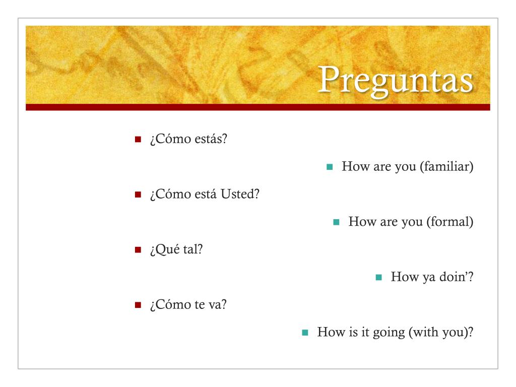 Preguntas • ¿Cómo estás? • How are you (familiar) • ¿Cómo está Usted? • How are you (formal) • ¿Qué tal? • How yadoin’? • ¿Cómo te va? • How is it going (with you)?