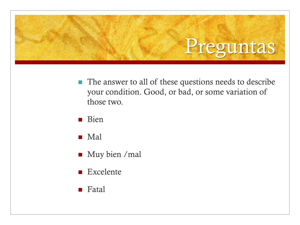 Preguntas • The answer to all of these questions needs to describe your condition. Good, or bad, or some variation of those two. • Bien • Mal • Muy bien /mal • Excelente • Fatal